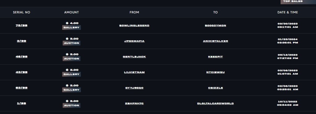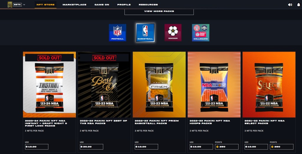 Tout d’abord, pour l’achat il y a la possibilité d’acheter sur le NFT store de panini des packs scellés. Ils sont en nombre limité et vous pouvez très bien les garder scellés pour les revendre par la suite. L’expérience d’ouverture est pas mal sans être dingue. il y a entre 3 à 5 cartes environ par pack, parfois 2 NFT. Pour l’instant, dans les packs achetés, il y a 2 communes et 1 rare. Certaines gammes (Prizm, nba hoops) sont clairement le versant numérique de la gamme déjà existante en papier. Pour d’autres, il y a des choses nouvelles et inédites. Je ne suis pas le plus spécialisé pour tout vous dire sur les différences.