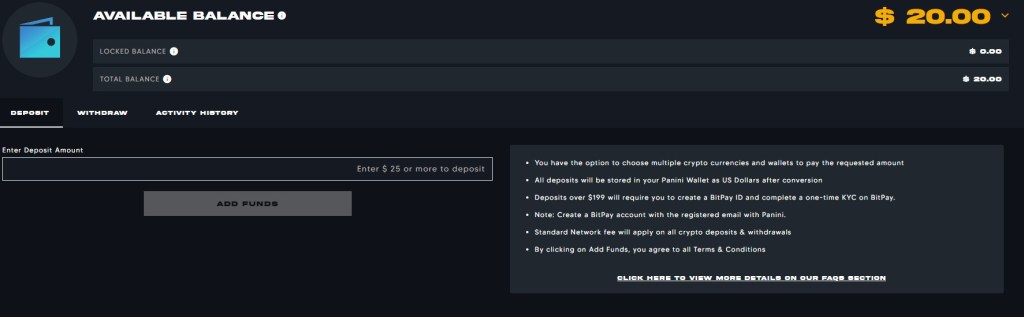 A ce sujet, je vous invite à être attentif aux paramètres de Bitpay car l’achat de cryptomonnaies génèrent des frais (fees). Vous avez le choix d’acheter la crypto que vous souhaitez et la somme déposée sur panini NFT est en US dollar. le transfert est instantané et une fois votre compte suffisamment crédité, vous pouvez procéder à vos acquisitions sur le market NFT entre particulier.